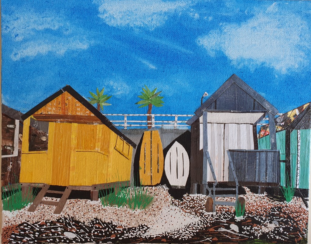 I’ve finished the set of beach huts I was working on, my first small body of work as an artist! I have hundreds of pictures of the beach, in particular the beach huts, When I was younger I always dreamed of owning one when I was older. The thought of being down there on a cold day, the sea churning, sitting in my little piece of heaven, warm, with a throw tucked over me, hot chocolate in hand, book by my side and the beautiful noise and colours on the other side of the glass.