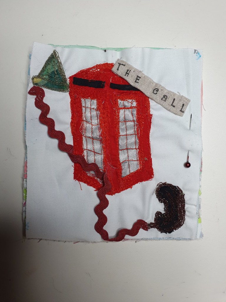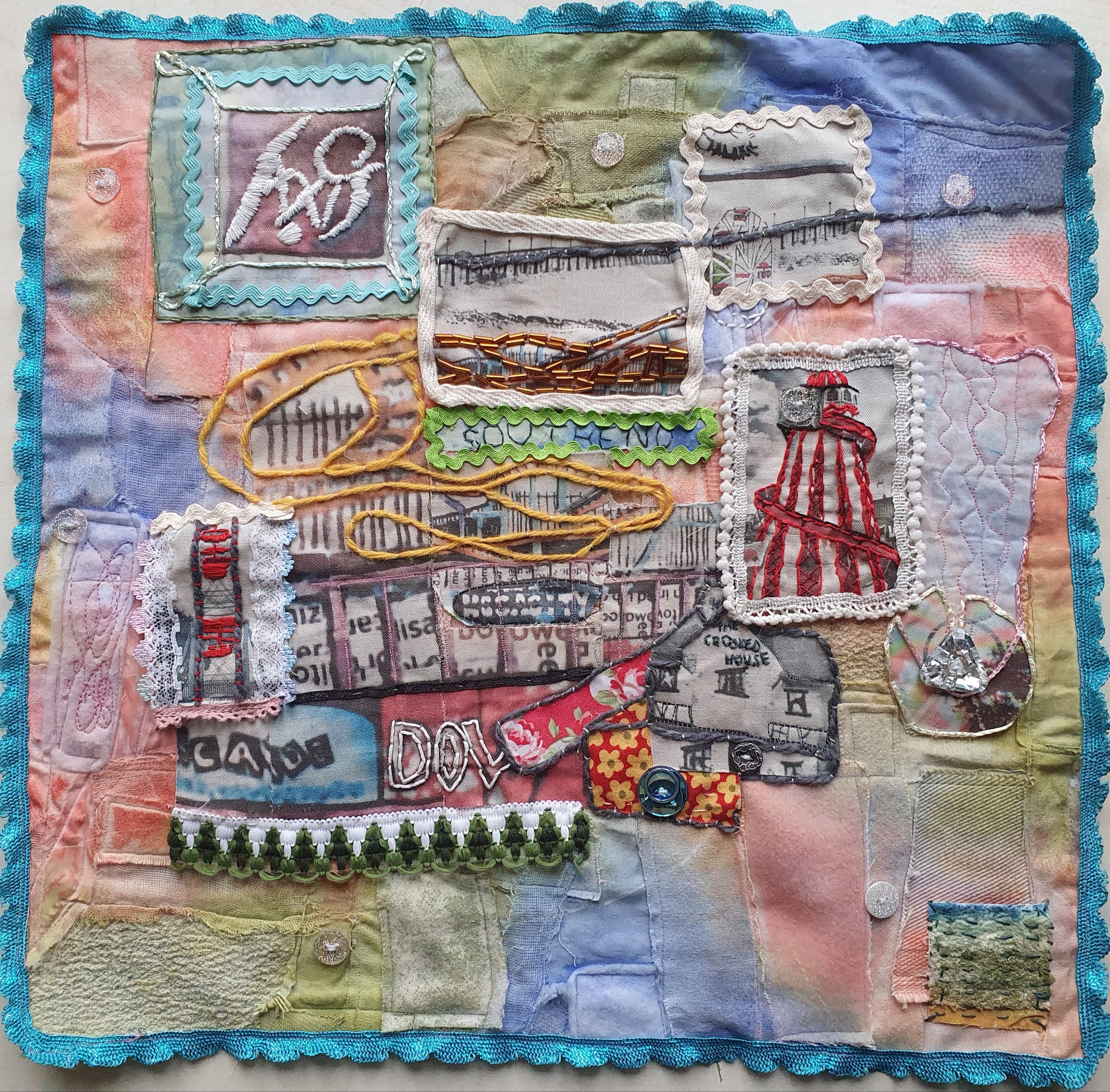 In my textiles course my tutor encouraged me to take a big photocopy of my collage, juxtaposition, and then find tiles in that to make a new textiles piece. I collaged my own material from lots of others, then painted it with water colours, then using embroidery and braids etc. I made a new collage piece, this time in textiles.