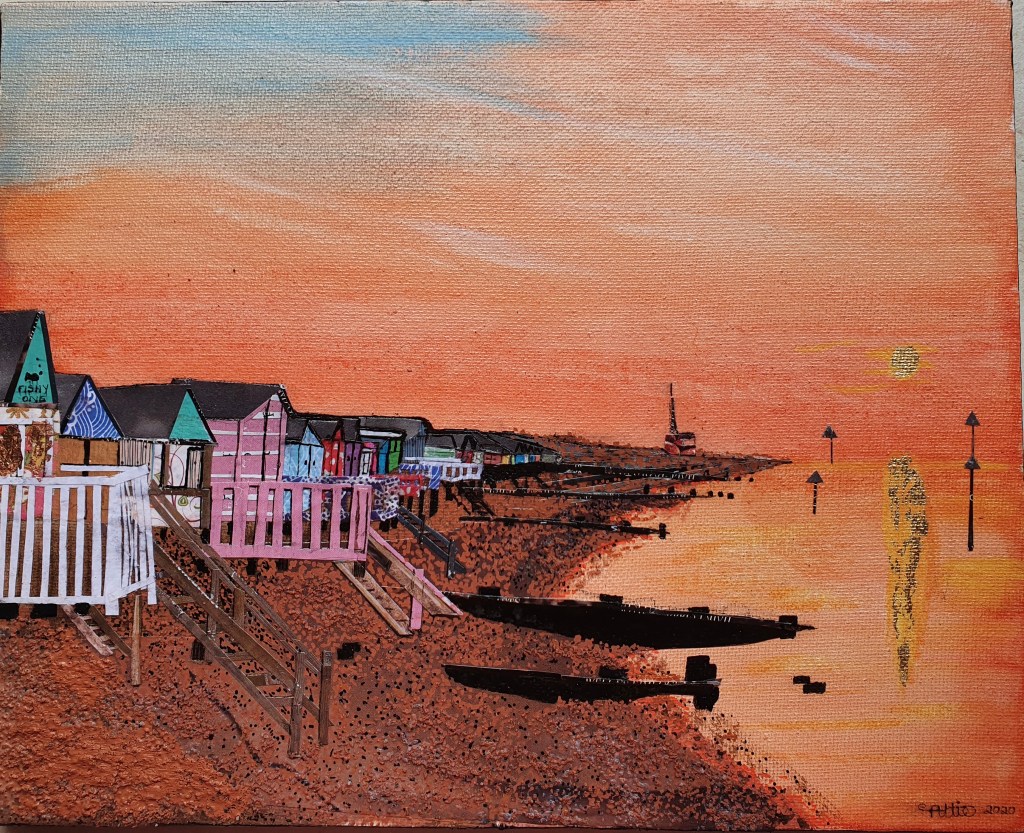 At the moment I’m working on a set of three beach hut studies from photos I have taken, the first is on here already, two huts in summer. The second I’m midway through, it’s a sunset scene and the third was taken when we had snow on them a while back now.