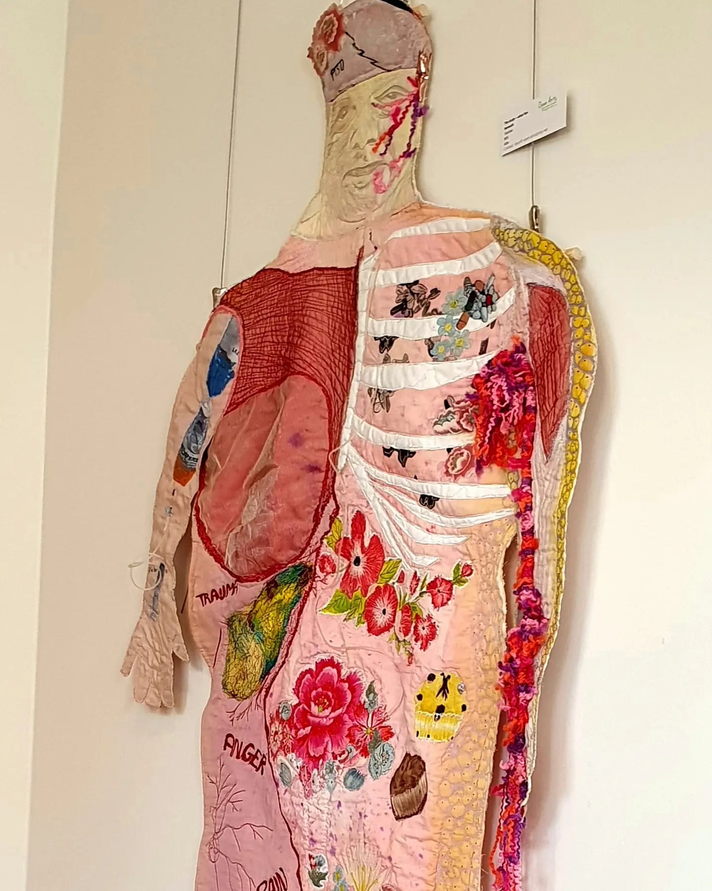 On this pattern I showed half of the body with the skin stripped back to show what was going on inside, the other half showed how things affected me on the outside that may be unspoken such as self harm for instance. I made a real effort not to hold back and be completely honest, even when it was uncomfortable to confront such as showing my fat, it’s there, it needed to be shown.