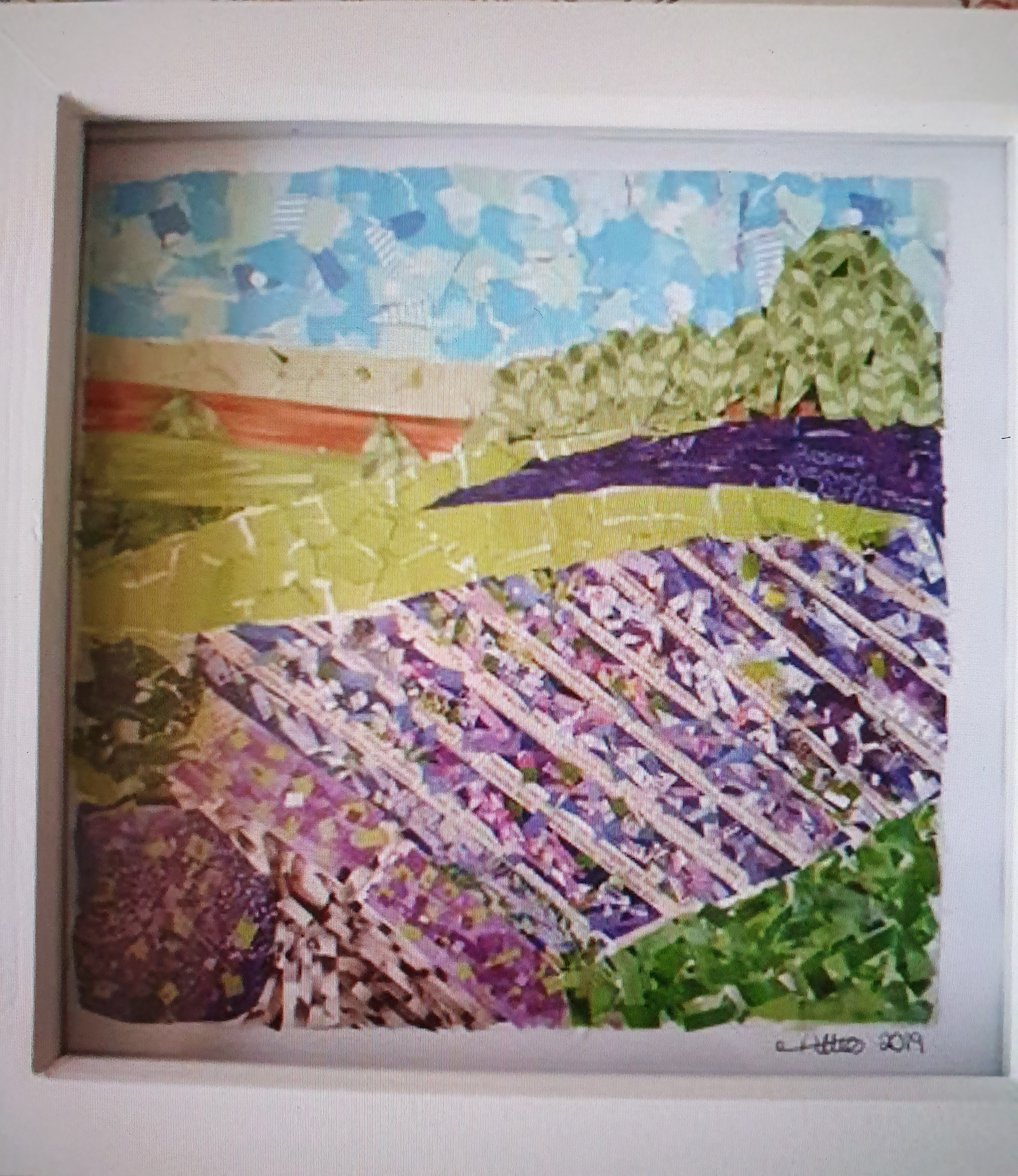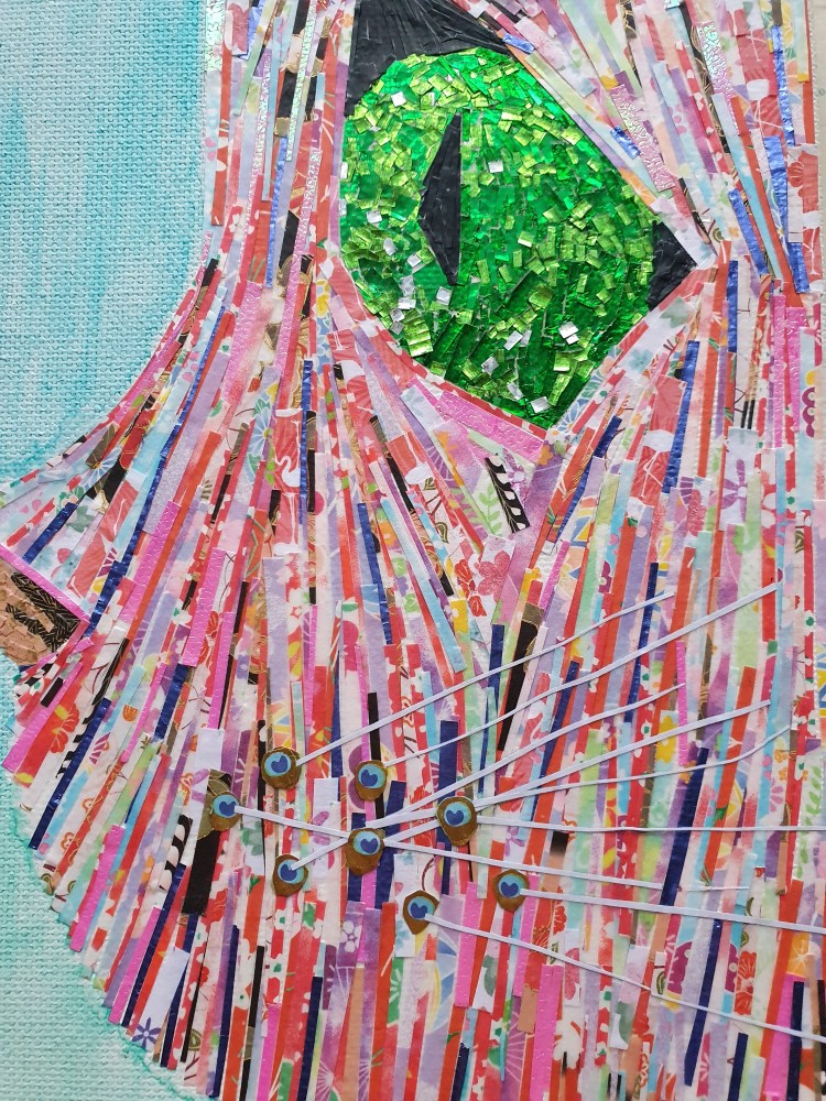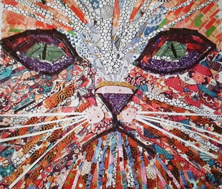 This was one of my first collages, it was the first time I’d collaged straight onto canvas and realised I loved it. I have two gorgeous black cats and I love their eyes so I started with the green eyes. I also had this beautiful paper left over from a craft kit so I cut it into strips and went along the lines of a tabby cat but with a lot more colour. I exhibited this in my first ever art trail, Rochford 2019 – incidentally where I was born! and it sold!! I was delighted. I’ve had lots of requests for Whiskers since, there is only one original Whiskers though, meow.