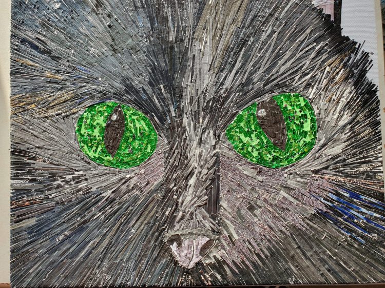 As the title says, My baby boy, one of my two black cats. I wanted to show that black isn’t really just black, its all shades of grey, copper, blue and black depending where the light hits the fur. I started with his big green eyes using tiny squares of holographic paper and flecks of black paper. I used silver to show the light in his pupil. The hardest job was remembering to go with the lay of the fur.