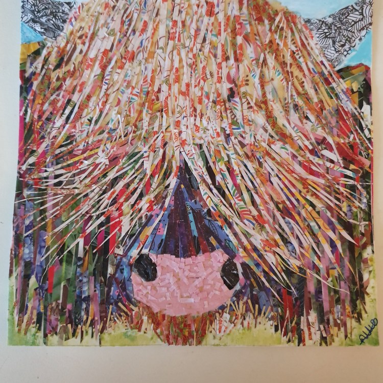 I was asked to do a highland cow closeup. When I said yes I underestimated how difficult the sweeping fringe would turn out to be! Cutting long thin strips and then making them flick like hair and sticking each piece on one at a time. Its a 6×6 inch piece but it took a long time to do because of this. I then had the challenge of where the eyes went, I had moved them about 3 times thinking no still doesn’t look right when I decided the obvious answer was his eyes were obscured by his fringe! And so was born Cant see….He is cheekily poking his tongue out too, naughty boy!